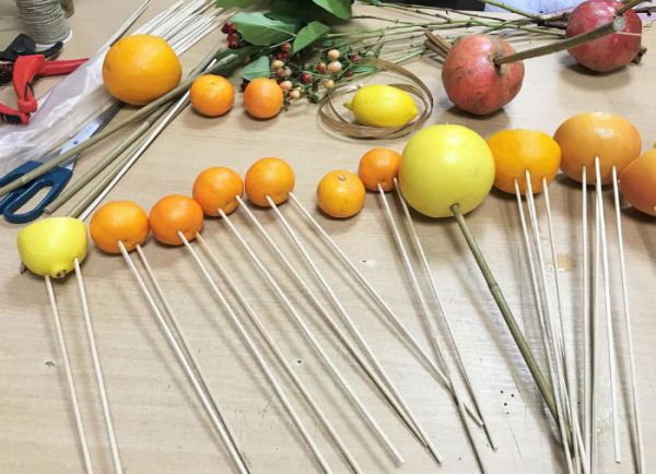 Първо вземете избраните от вас плодове и ги набучете на дървени шишчета. Нашият съвет е плодовете да са поне по 2 и да са поне 2 вида. Също така ако са големи като портокали или грейпфрути е добре да ги фиксирате с поне две шишчета. Това се прави в случай, че едното от двете се счупи, което е доста възможно. Ако пък е възможно да намерите за тежките плодове ще е най-добре да използвате бамбукови пръчки, те ще са идеални.