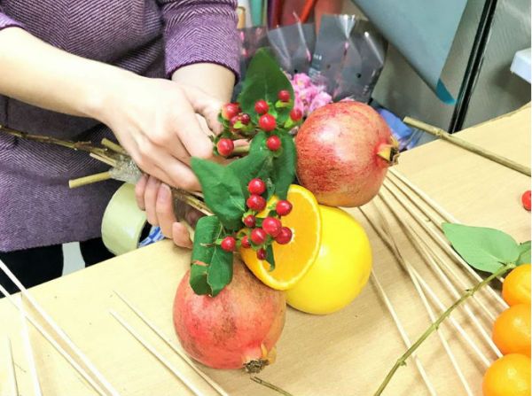 Сега остава просто да съберете букета. Можете да го подредите и аранжирате според вашата фантазия, но ето и нашите няколко съвета за дизайн. Големите плодове сложете по средата на букета, а малките около тях. Така ще запазите формата. Ако случайно е трудно да се закрепят просто така, можете да залепвате всяко шишче за другото с тиксо. За по-красиво на някои места между плодовете закрепете клончета от калина, хвойна, хиперикум, чепка грозде с клон и листа, френско грозде или други подобни. Някои от тях не стават за ядене, но пък ще внесат повече цвят в букета. За да не се счупят клончетата от натиска на плодовете можете да ги увиете в хартия или целофан.
